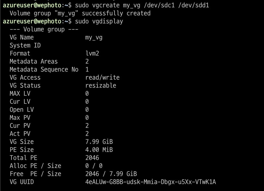 $ vgcreate my_vg /dev/sdc1 /dev/sdd1